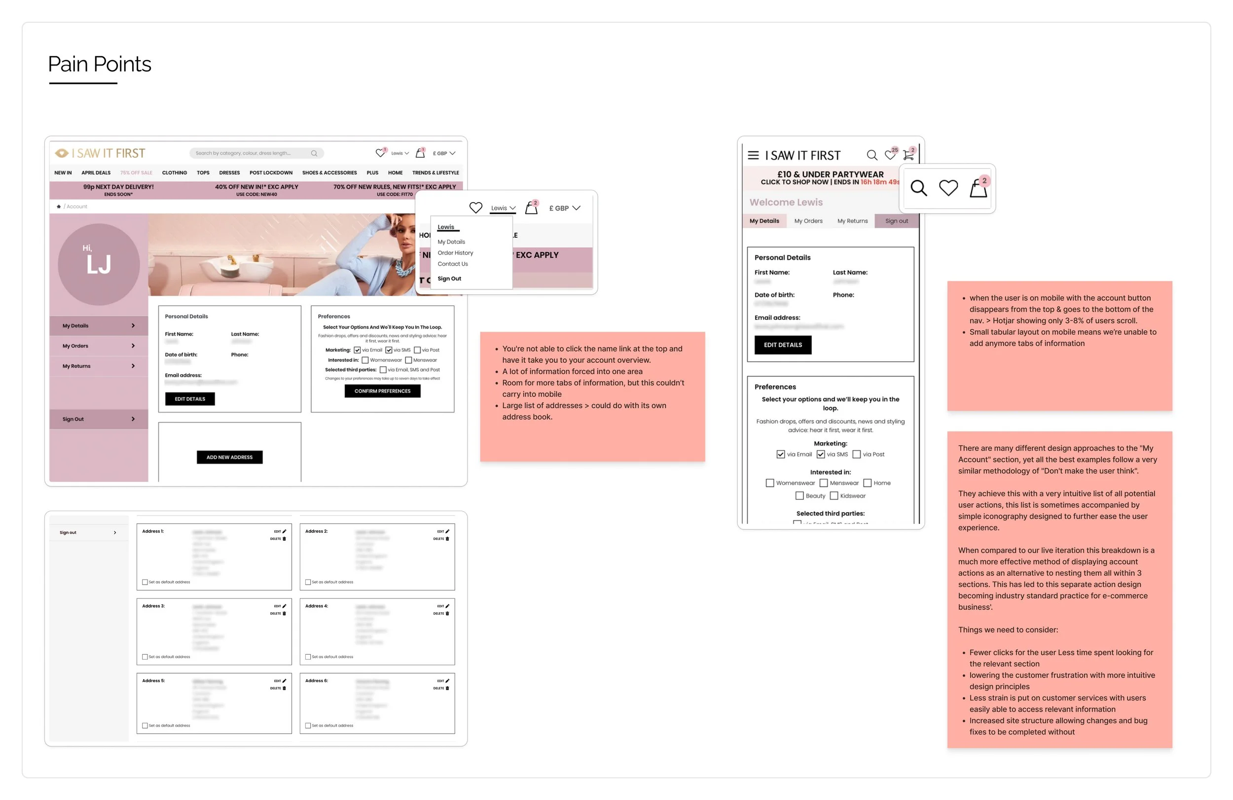 Account is another large project I worked on at I SAW IT FIRST. The aim of this project was to condense and re-structure the account information page, creating a single touch point for users with any account related queries. This project required me to put the users needs and expectations at the forefront of the re-design, whilst also taking into account stakeholders expectations and recommendations.